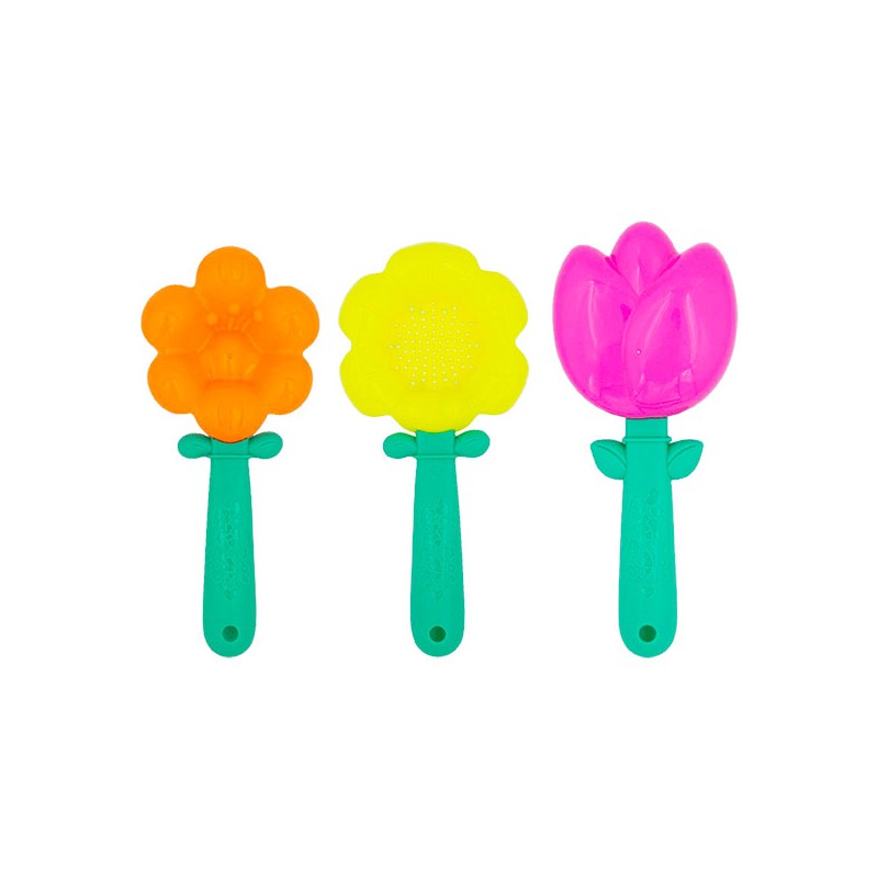 1 filet de 3 pelles à sable 24 cm, 2 modèles assortis : 2 pelles et 1 tamis en forme de fleur