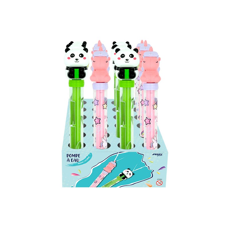 1 pompe à eau 26 cm en display de 24, 2 modèles assortis : panda, licorne