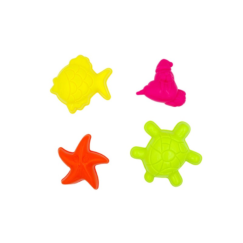 1 filet de 4 moules à sable : 1 tortue, 1 morse, 1 étoile de mer, 1 poisson