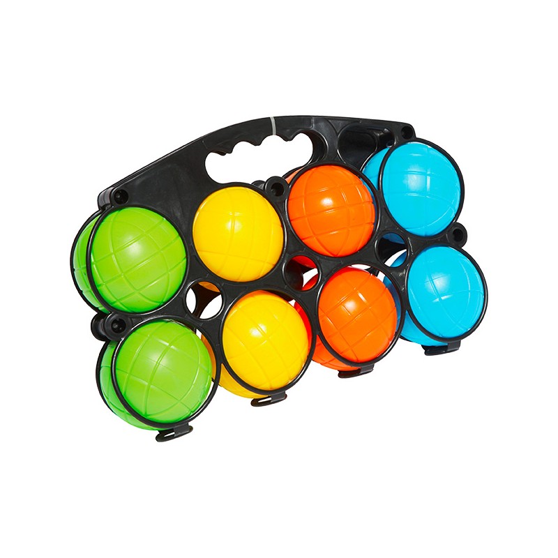 8 boules plastique colorées + 1 cochonnet, 1 filet de transport