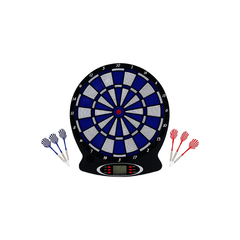 1 cible éléctronique jusqu'à 8 joueurs, ø39 cm + 6 fléchettes. 18 jeux possibles, 159 variantes de points. Fonctionne avec 3 piles LR6 non incluses. Livret d'instruction inclus