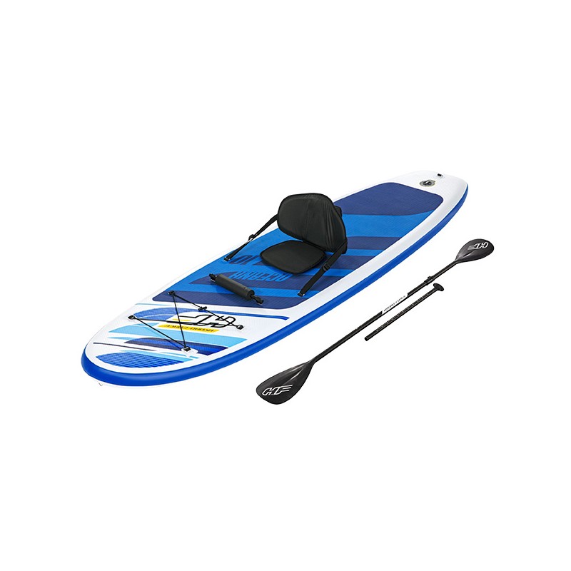 1 paddle Sup 305 cm avec 1 siège amovible pour une transformation en kayak, 1 pagaie, 1 pompe et 1 sac de transport. Charge max 120kgs