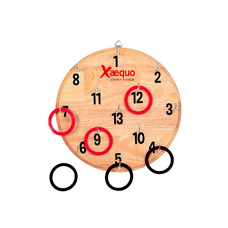 1 cible en bois Ø 29 cm, 13 crochets métal, 6 anneaux à lancer