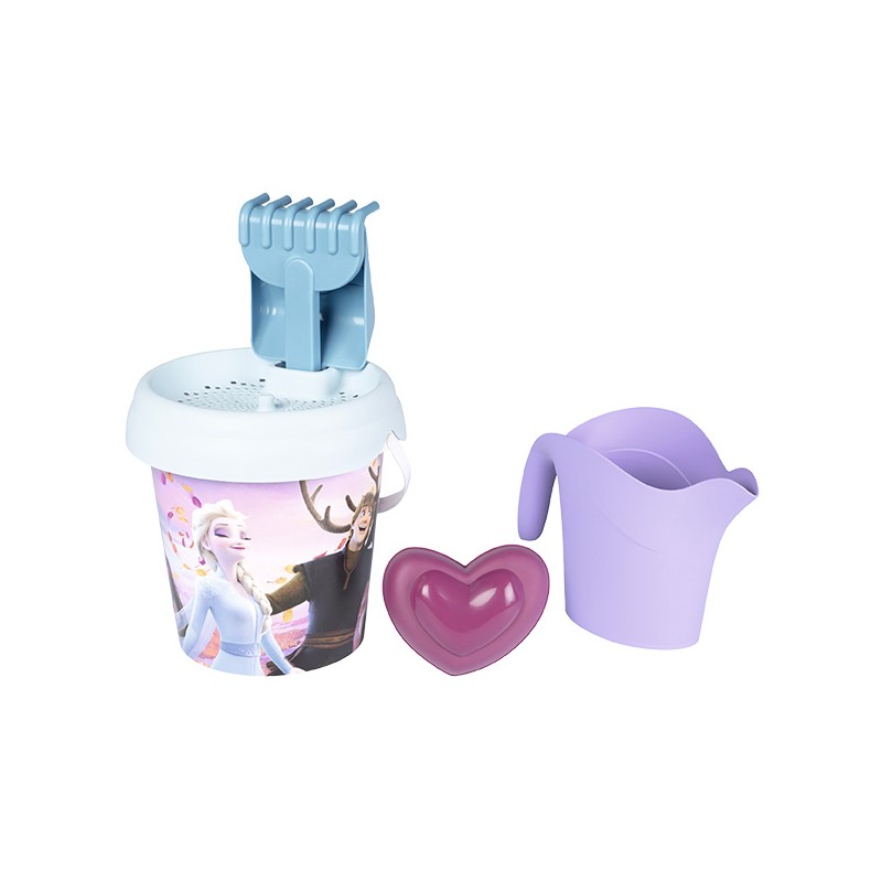 1 seau décoré Frozen, 1 tamis, 1 doublette, 1 moule, 1 arrosoir