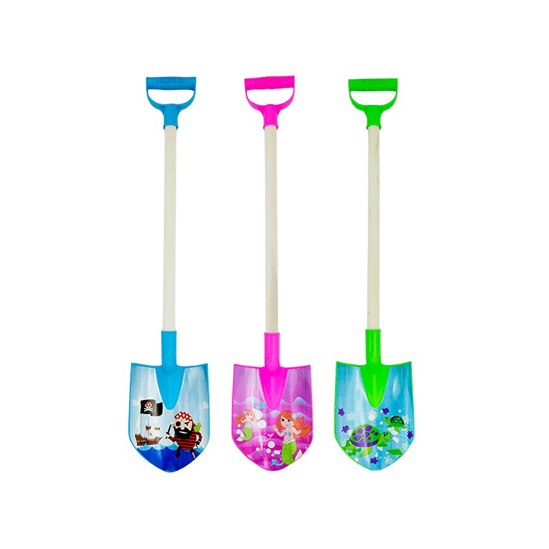 1 pelle manche bois 75cm. 3 décors assortis : pirates, sirène, tortue
