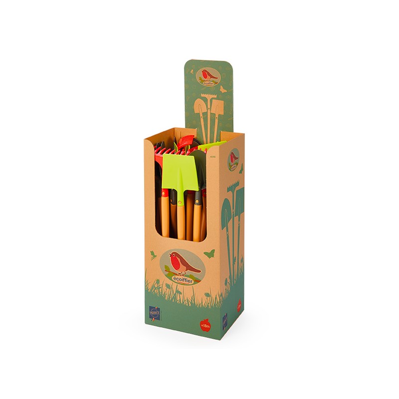 1 outil de jardin en display de 24, 3 modèles assortis : 8 pelles, 8 bêches, 8 rateaux de 70 cm