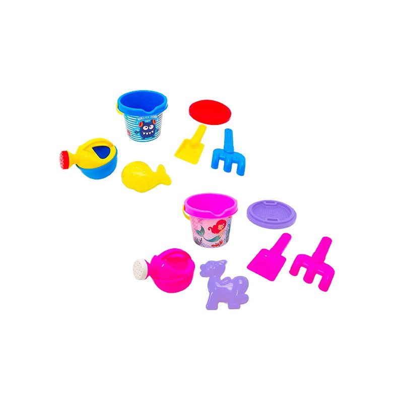 2 modèles assortis : 1 seau sirène, 1 seau monstre, 1 pelle, 1 rateau, 1 arrosoir, 1 moule à sable, 1 tamis