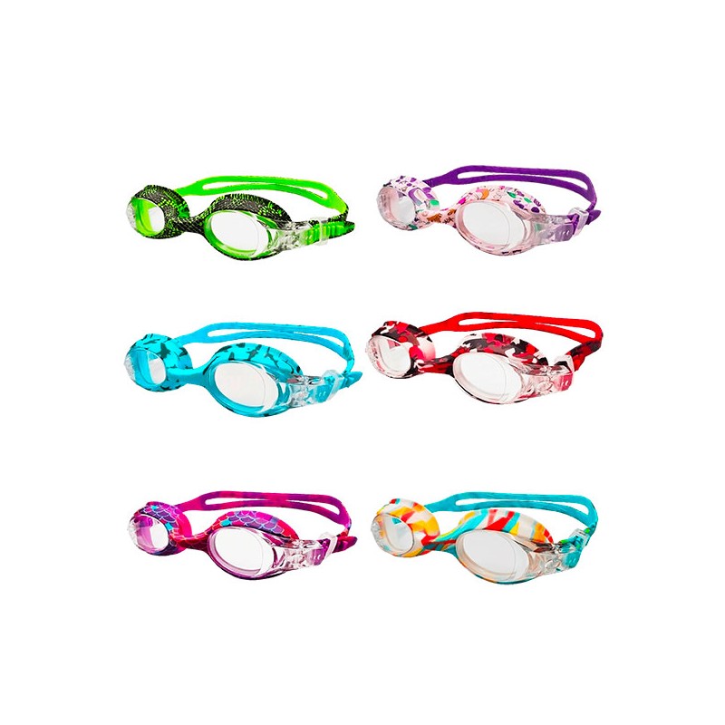 6 modèles assortis : crocodile, sirène, écailles, camouflage, rayures, craquelures. Verres en polycarbonate, jupe et sangle en silicone, traitement anti-buée, protection anti-uv