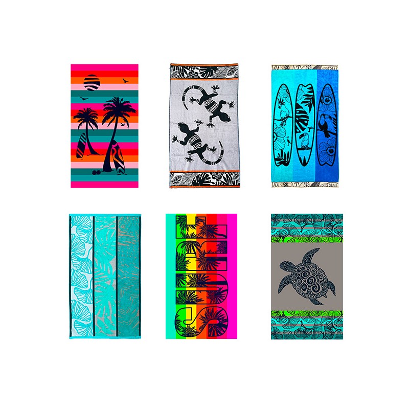 6 décors assortis. 1 serviette décorée jacquard 100 x 175 cm, 470 gr