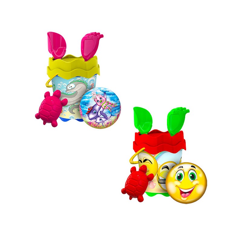 2 modèles assortis : 1 seau ø17cm animaux marins, 1 seau ø17cm emoji, 1 tamis, 1 doublette, 1 moule à sable, 1 balle décorée ø14 cm