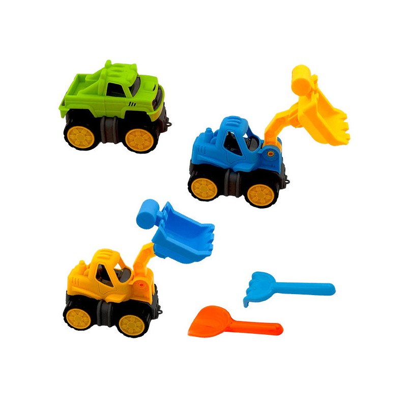 3 modèles assortis : 1 pick up 12,5 cm, 1 seau château, 1 doublette , 2 tractopelles de 22 cm, 1 doublette