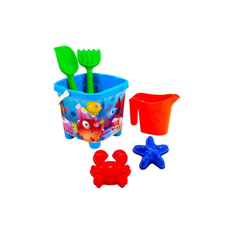 1 seau carré 17 cm, 1 doublette 23 cm, 1 arrosoir et 2 moules à sable