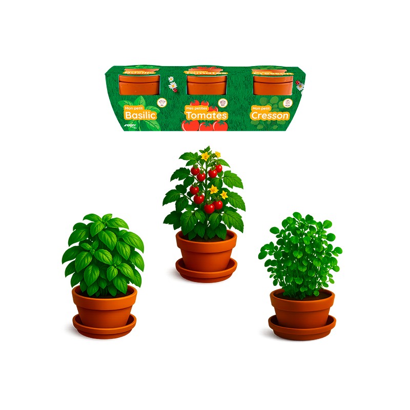 Trio de plantes gourmandes composé de : 3 sachets de graines (basilic grand vert, tomate cerise et cresonnette) 3 pots en terre cuite de 8 cm + coupelle, 3 plaquettes de terre de coco deshydratée et compressée