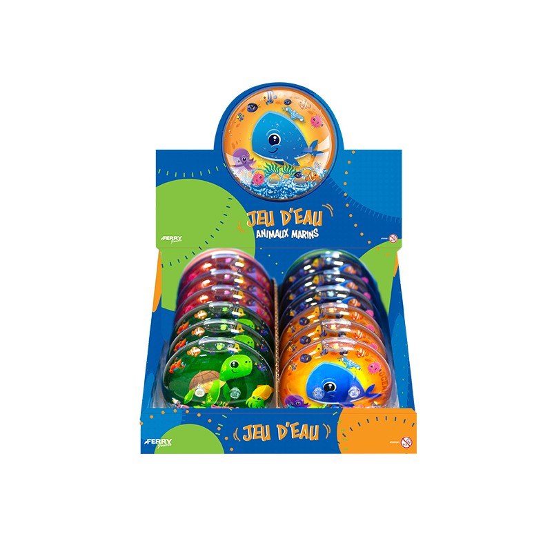 1 jeu d'eau animaux marins en display de 12, 4 modèles assortis : 1 tortue, 1 baleine, 1 dauphin, 1 requin