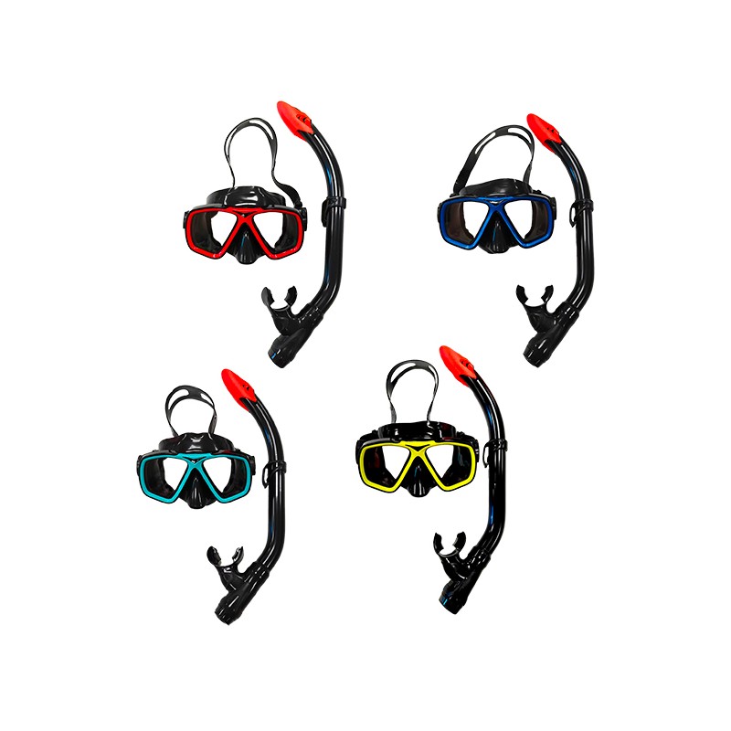 1 set de plongée adulte contenant 1 masque (verres en polycarbonate, jupe et sangle en pvc) et 1 tuba (avec soupape)