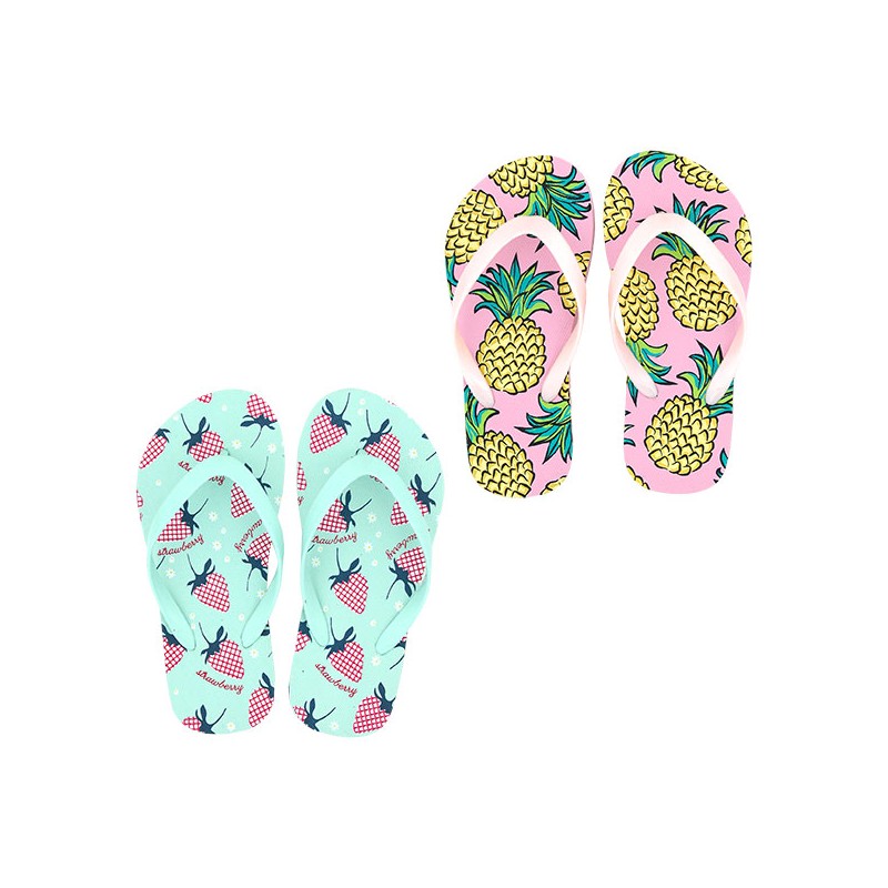 2 décors assortis : fraise, ananas. 1 paire de tongs taille 28/35