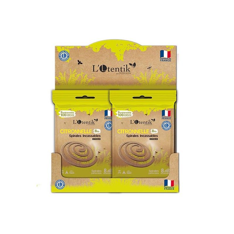 1 sachet de 8 spirales à la citronnelle en display de 20. Spirale avec support 100 % naturel et biodégradable, parfumée à la citronnelle, utilisée pour éloigner les insectes volants. Chaque spirale dure 3h30 selon les conditions climatiques.