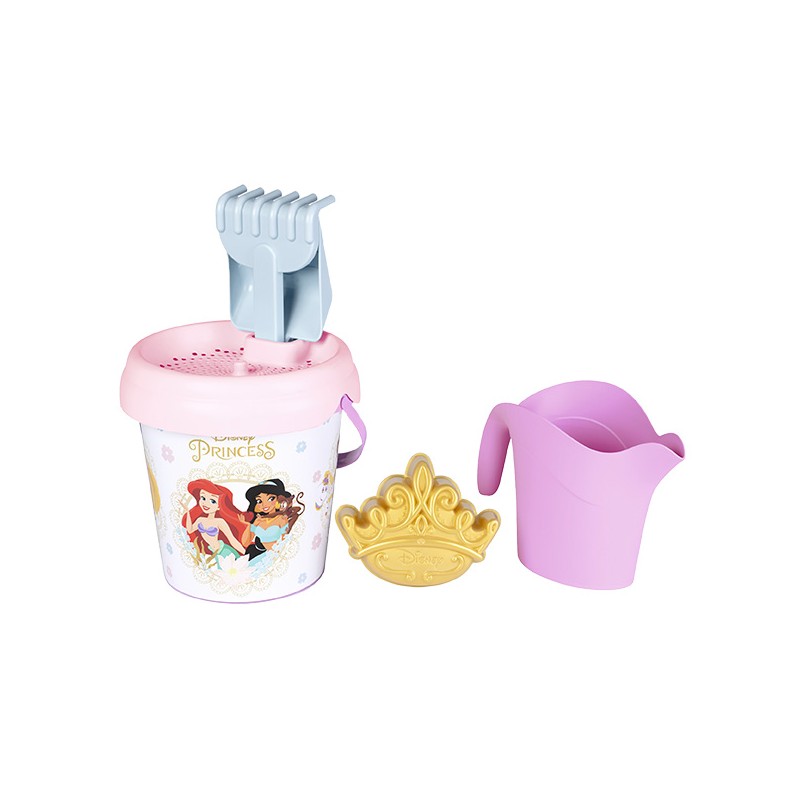 1 seau décoré Princesse, 1 tamis, 1 doublette, 1 moule, 1 arrosoir