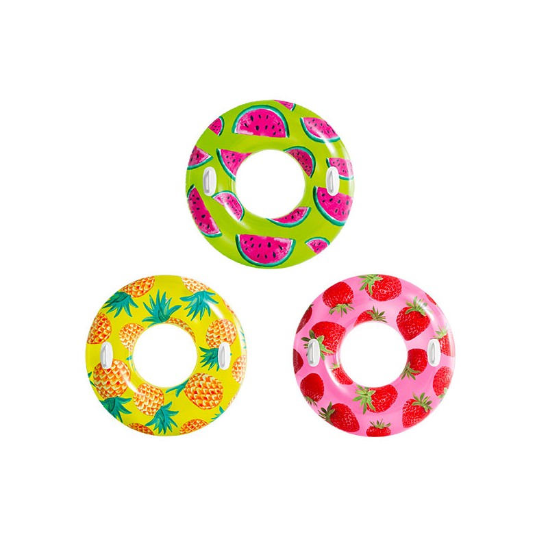 1 bouée Fruits à poignées ø107 cm. 3 modèles assortis : ananas, fraise, pastèque