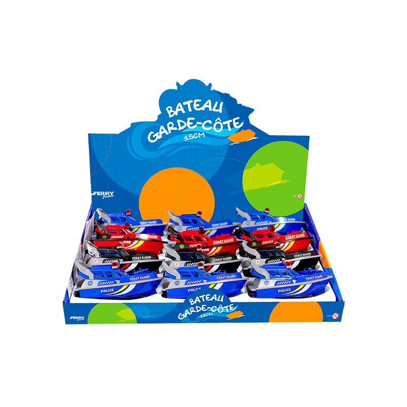 1 bateau garde-côte 15 cm à friction en display de 12, 2 modèles assortis : 2 police, 1 pompier