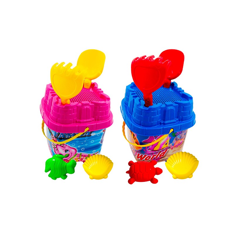 1 seau château fort 20 cm décoré, 1 tamis, 1 doublette, 2 moules à sable