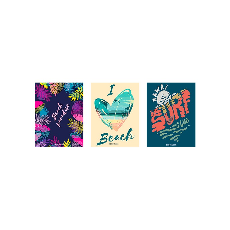3 décors assortis : beach paradise, i love beach, Hawai Surf