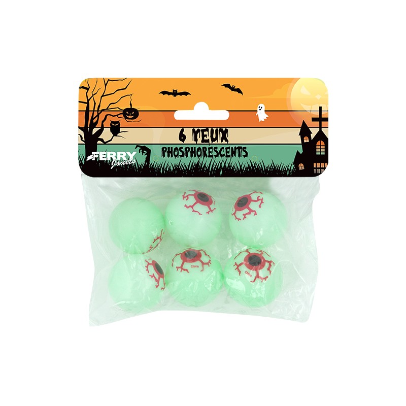 6 globes oculaires qui brillent dans le noir pour une ambiance mystérieuse et surprenante.