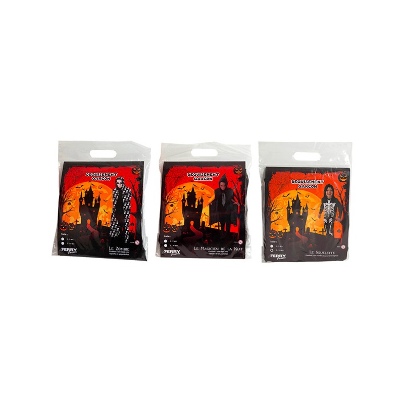 3 modèles assortis de 4/6ans et 7/10ans : 1 magicien de la nuit, 1 squelette, 1 zombie pour des fêtes pleines de mystère et daventure.