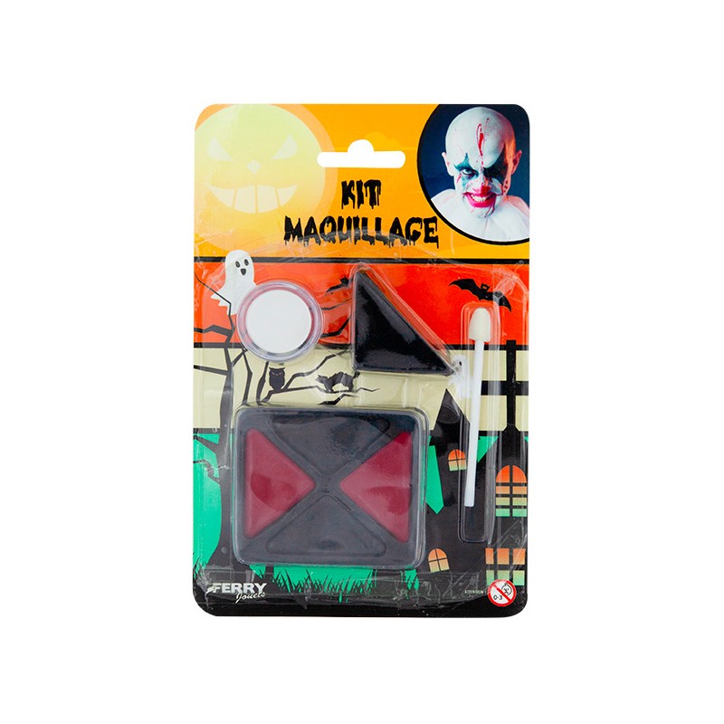 1 palette de maquillage bicolore, 1 pot de maquillage, 1 éponge et 1 pinceau pour créer un look drôle et coloré.