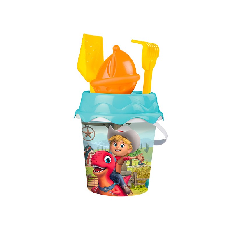 1 seau décoré Dino ranch, 1 tamis, 1 doublette, 1 moule