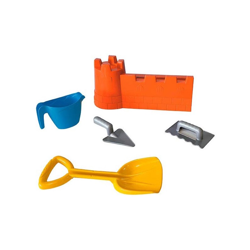 1 moule 40 cm orange, 1 pelle jaune, 1 arrosoir bleu, 1 truelle, 1 taloche