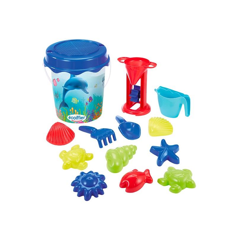 1 seau rond 21 cm, 1 tamis, 1 doublette, 1 moulin à sable, 1 arrosoir broc, 10 moules à sable
