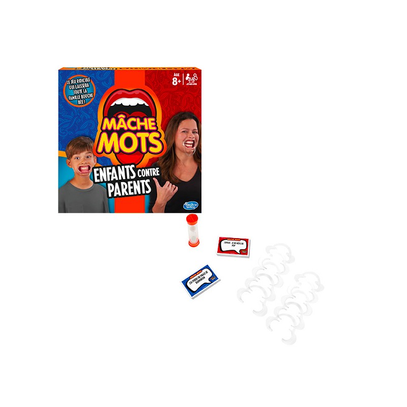 Mâche-mots, le jeu ridicule qui vous laissera bouche bée ! Et maintenant, les enfants vont défier les parents ! Mets le Mâche Mots dans ta bouche et fais deviner des expressions ! Version familiale avec 2 tailles différentes. De 4 à 10 joueurs.