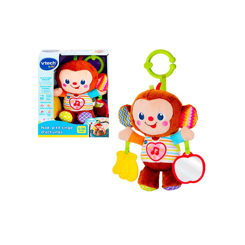 Noé, p'tit singe d'activités. De 3 à 36 mois. Grâce à ses différentes textures, son bouton lumineux, son miroir et son anneau de dentition, ce petit singe tout doux stimule les sens des tout-petit et éveille leur curiosité.