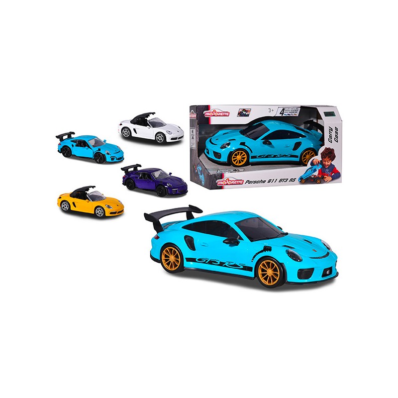 Véhicule Porsche 35cm pouvant transporter 9 voitures à l'échelle 1/64ème (7,5cm). Véhicule à roue libre avec son original Porsche Racing. Si tu retournes ta Porsche, tu y retrouveras tes 4 véhicules 1/64ème qui sont inclus.