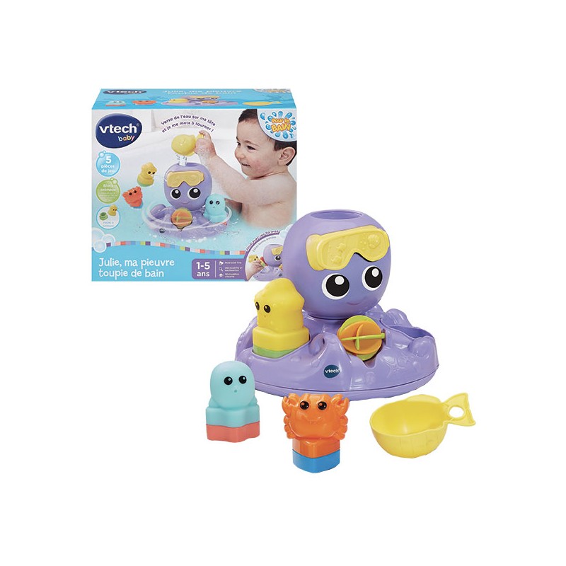 Julie, ma pieuvre toupie de bain - 1 - 5 ans Une toupie Pieuvre et ses 4 accessoires pour amuser et éclabousser Bébé pendant le bain ! Julie, la pieuvre toupie est un jouet de bain trop rigolo ! Lorsque Bébé met de l’eau sur sa tête grâce au vers