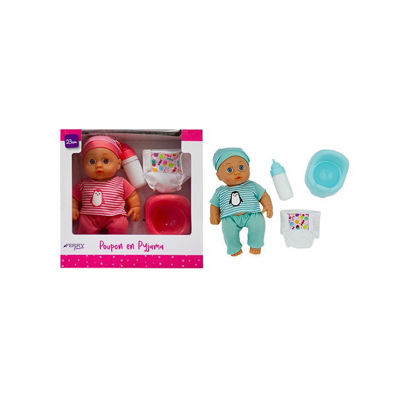 1 poupon 23 cm en pyjama, 1 couche, 1 pot, 1 biberon Prêt pour le dodo ou le pot, ce poupon tout doux invite à jouer comme les grands. Avec ses accessoires, chaque moment devient une nouvelle histoire à inventer.