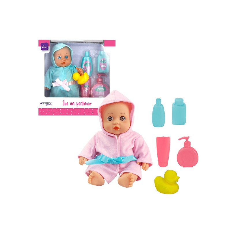 1 poupon 23 cm en peignoir, 1 canard, 4 produits de toilette. Les petits adorent rejouer la routine du soir avec ses accessoires de toilette inclus.