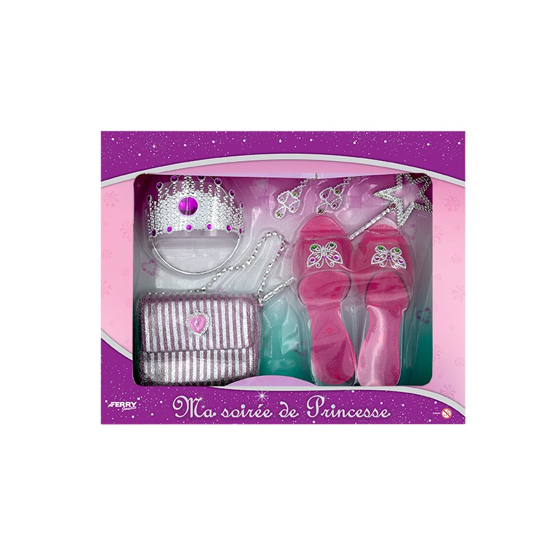 1 coffret soirée de princesse composé d'un sac, de chaussures de princesse, d'une couronne, d'une baguette et d'une paire de boucle d'oreilles Age : 3a+