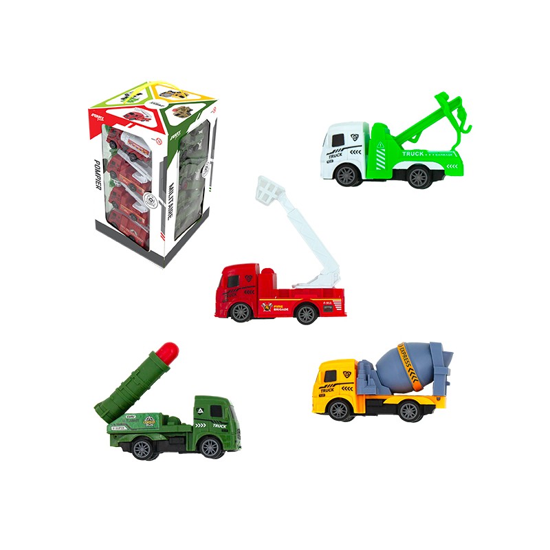 1 pack avec poignée de transport contenant 16 camions d'intervention à rétrofriction (pompier, travaux publics, militaire, propreté). Chaque véhicule file à toute vitesse grâce à la rétrofriction. Pratique : tout se range dans la mallette.
