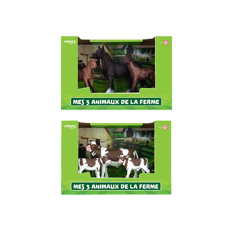 2 modèles assortis : vache, chevaux. 1 animal de 13 cm et 2 animaux de 7 cm , chaque modèle invite à découvrir la vie rurale de façon ludique et éducative.