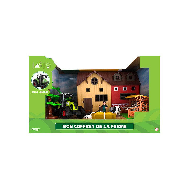 1 coffret contenant : 1 ferme, 1 tracteur à friction son et lumière, 1 remorque, 2 vaches, 1 figurine et des accessoires, les enfants samusent à cultiver, nourrir et soccuper de tout.