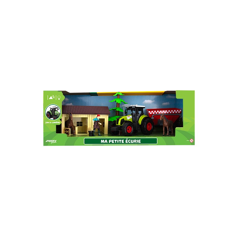1 coffret contenant : 1 écurie, 1 tracteur à friction son et lumière, 1 remorque, 2 chevaux, 1 figurine, 1 arbre et 1 seau, ce coffret offre des heures de jeu au cur de la campagne.