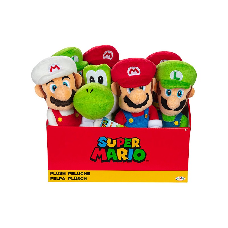 Collectionne les peluches de l'univers Nintendo de 20 cm avec Luigi, Mario, Mario avec sa tenue blanche et Yoshi.