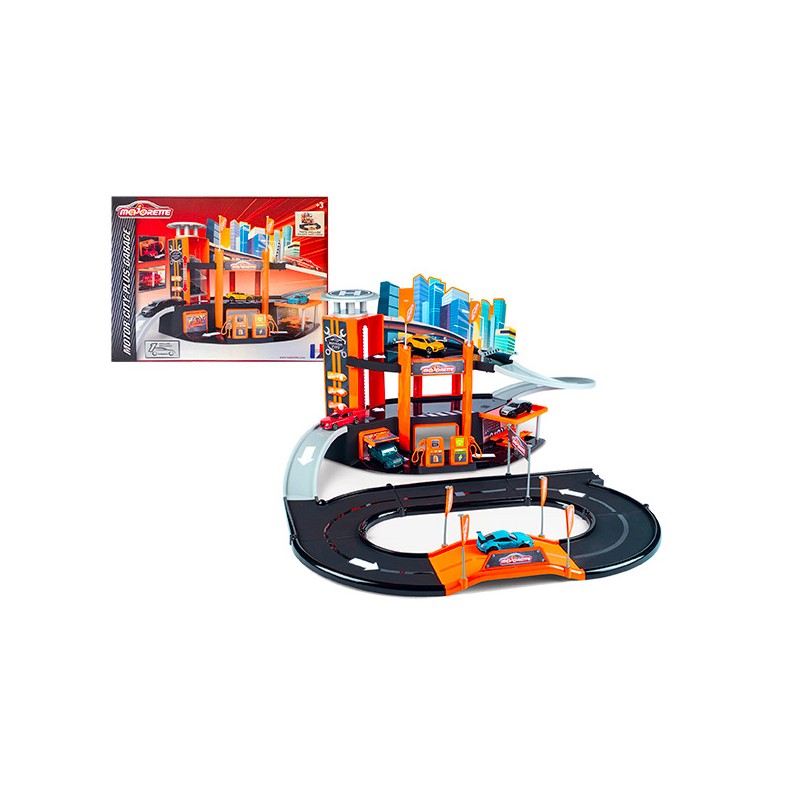 Garage Majorette regroupant des fonctions essentielles : pompe à essence, atelier mécanique, ascenseur, rampes, garage à voitures, pistes. Livré avec une voiture Majorette. Age : 0