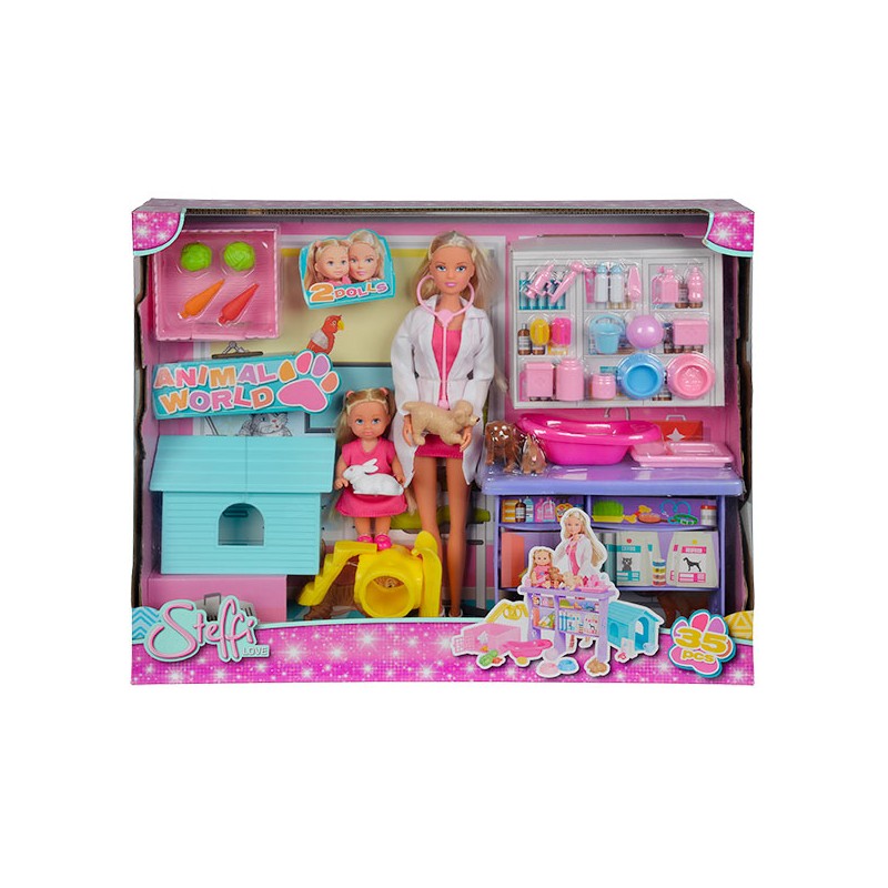 Ta poupée Steffi travaille dans une clinique vétérinaire ! Elle est accompagnée d'Evi et vont soigner des animaux ! Elles disposent d'un bel équipement et de nombreux accessoires qui leur permettent de prendre soin des 4 animaux qui sont avec elle.