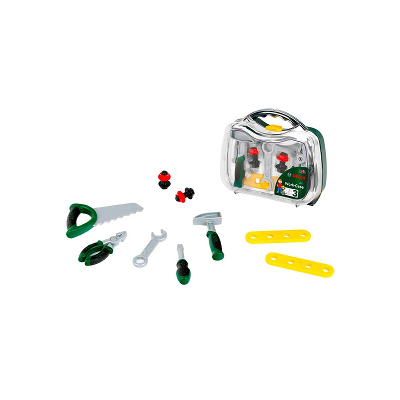 Cette mallette transparente BOSCH contient les accessoires de bricolage suivants : scie, pince, marteau, clé à molette, vis, écrous, lattes et tournevis. Mallette idéale pour faire ses premiers pas dans le monde du bricolage.