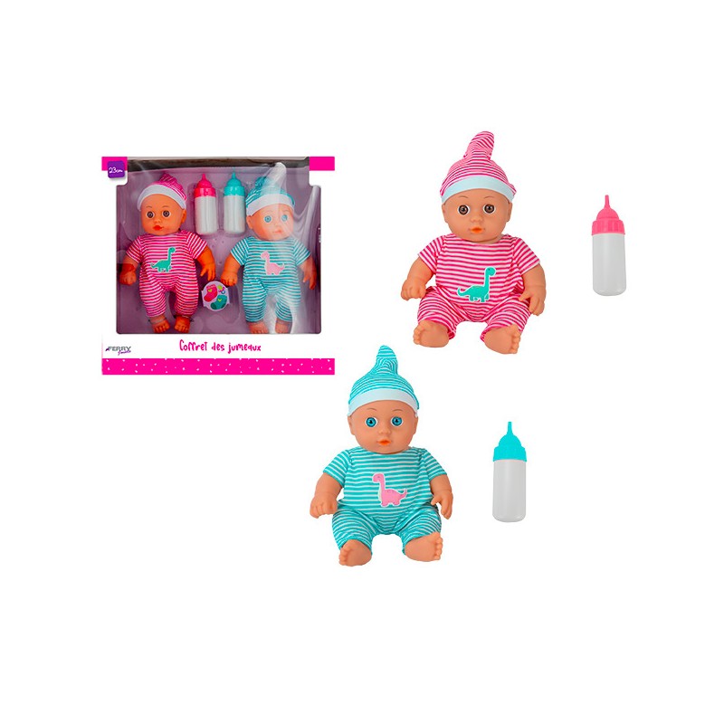 1 coffret de 2 poupons de 23 cm avec leurs biberons de lait! Parfaits pour samuser à donner le lait et vivre des moments complices à deux.