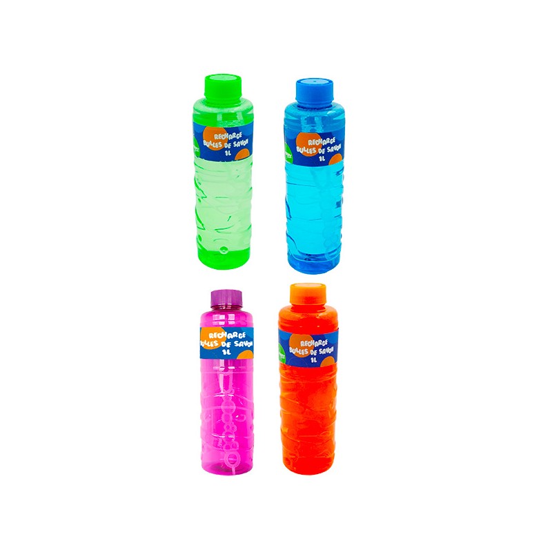 1 recharge de 1 litre de bulle de savon, 1 baguette à bulles. Pour créer des bulles colorées et magiques lors de moments de jeu en plein air.