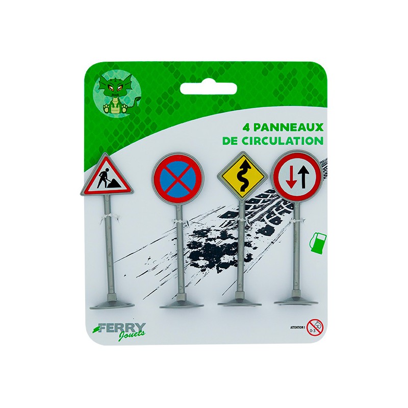 2 modèles assortis : 4 panneaux (stop / priorité à droite / double flèche / route prioritaire). 4 panneaux (sens interdit / interdit de stationner / école / travaux)